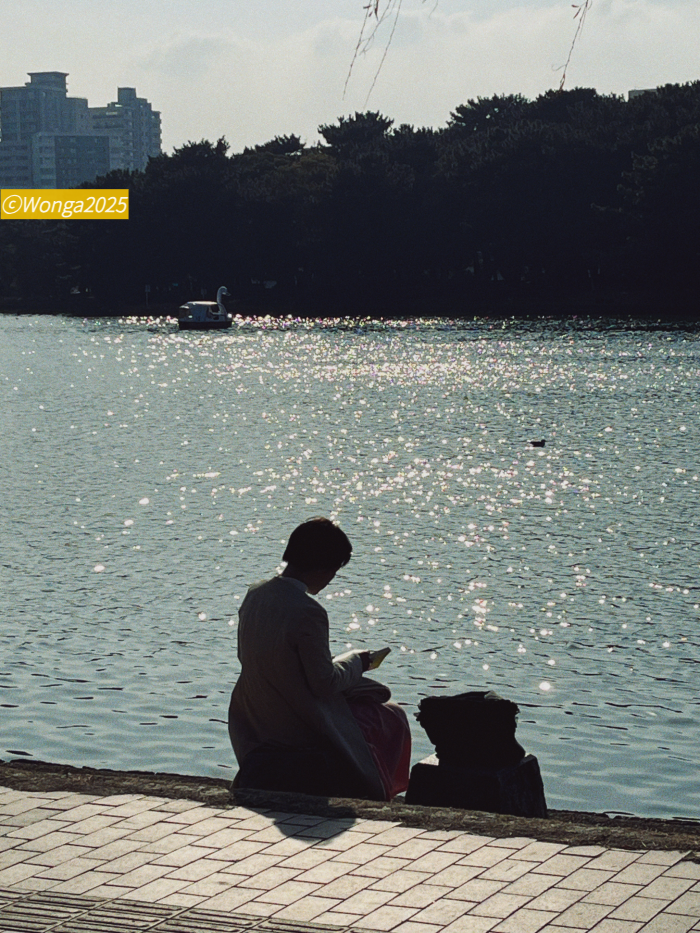 그치만 오호리공원 호수, 눈부시게 빛나는 윤슬 앞에 앉아 이번 여행의 첫 일기를 적었어.